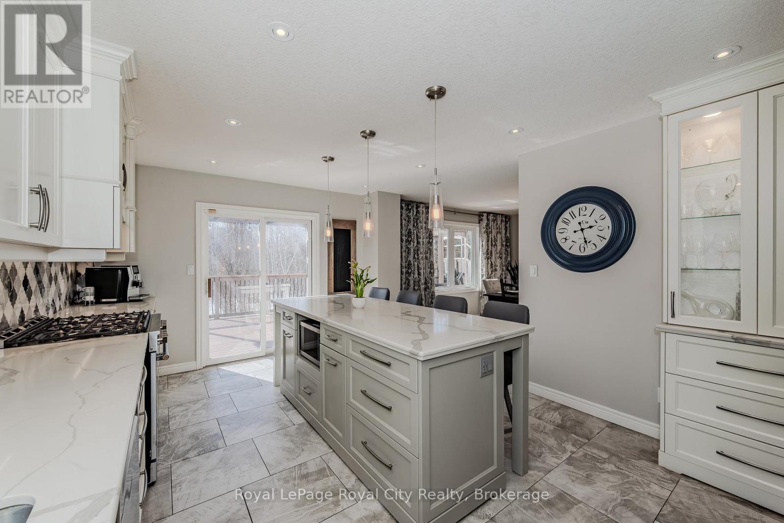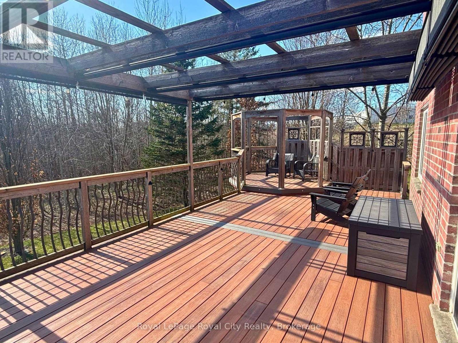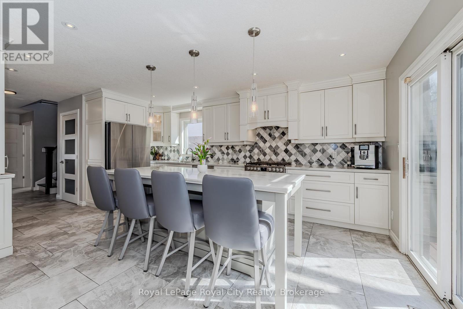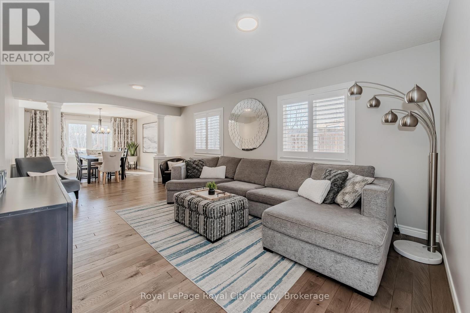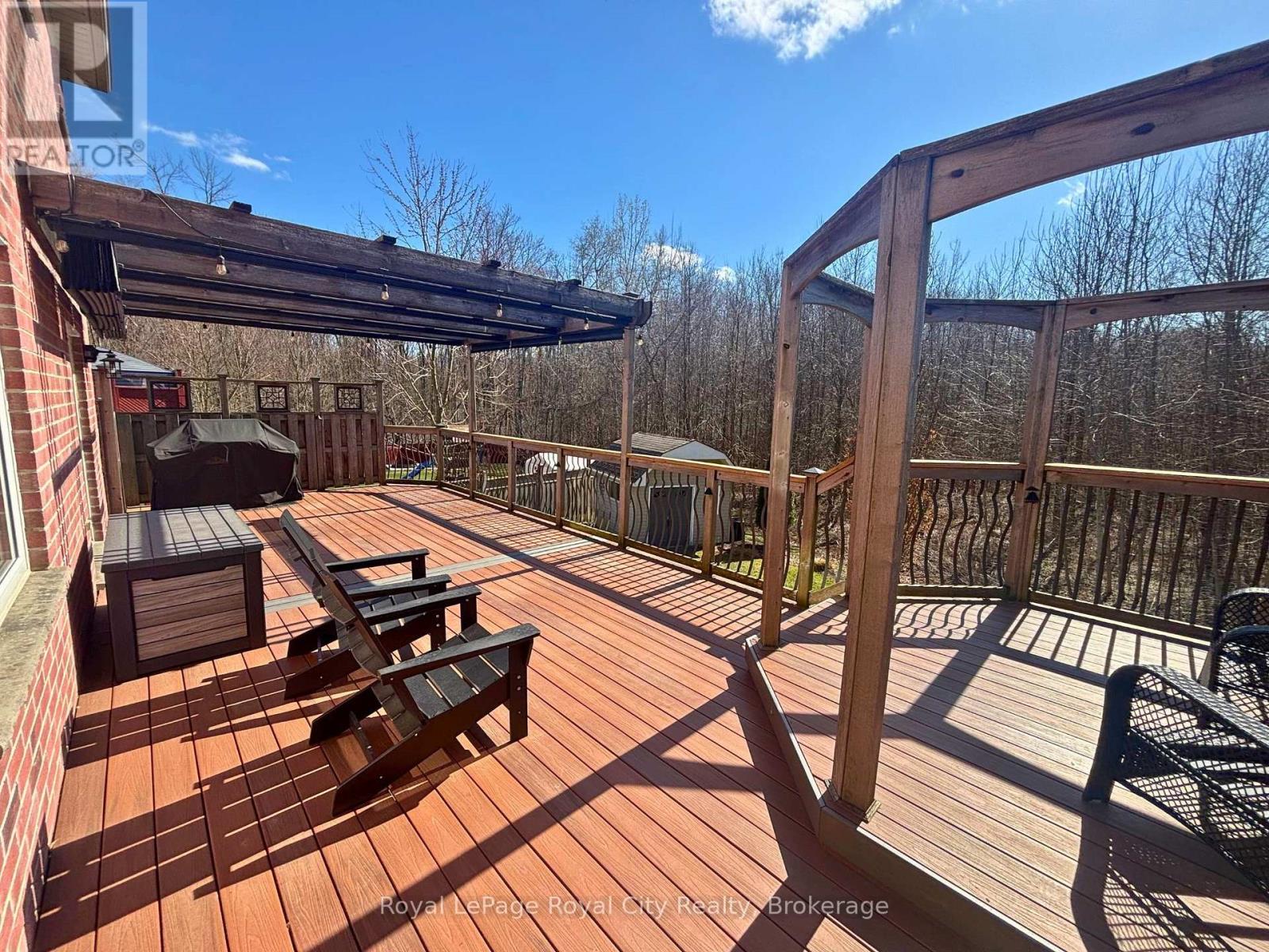 This exceptional 2,300+sqft home is nestled on a quiet cul-de-sac and backs onto scenic greenspace in one of Guelphs most desirable neighbourhoods. The meticulously maintained and tastefully renovated interior showcases an inviting open concept living and dining area that is beautifully enhanced by engineered hardwood flooring and large windows. The heart of the home is the elegant kitchen, featuring Quartz countertops, a spacious island with a breakfast bar, and sleek modern finishes- perfect for both casual meals and entertaining. Patio sliders from the kitchen lead to an expansive upper deck, ideal for enjoying morning coffee or evening barbeques while overlooking the lush, private backyard. The main level also offers a convenient office space and a 2 piece bathroom. A grand curved staircase ascends to the second level, hosting the stunning primary suite, three additional generously sized bedrooms (one with private access to the balcony), and a 4 piece main bathroom. The primary retreat boasts a walk-in closet and a luxurious 4 piece ensuite, featuring a glass-enclosed shower and a deep soaker tub. The fully finished walk-out basement is designed for relaxation and entertainment, offering a huge recreation room with an attractive gas fireplace, a laundry area, and a 3 piece bathroom. Enjoy direct access from the basement out to the patio area with beautiful gardens and a sprawling backyard. Additional features include a concrete driveway, a spacious 2-car garage, and impeccable curb appeal. Located close to parks, schools, shopping, and trails, this home is a rare find and a must see! (id:14494)