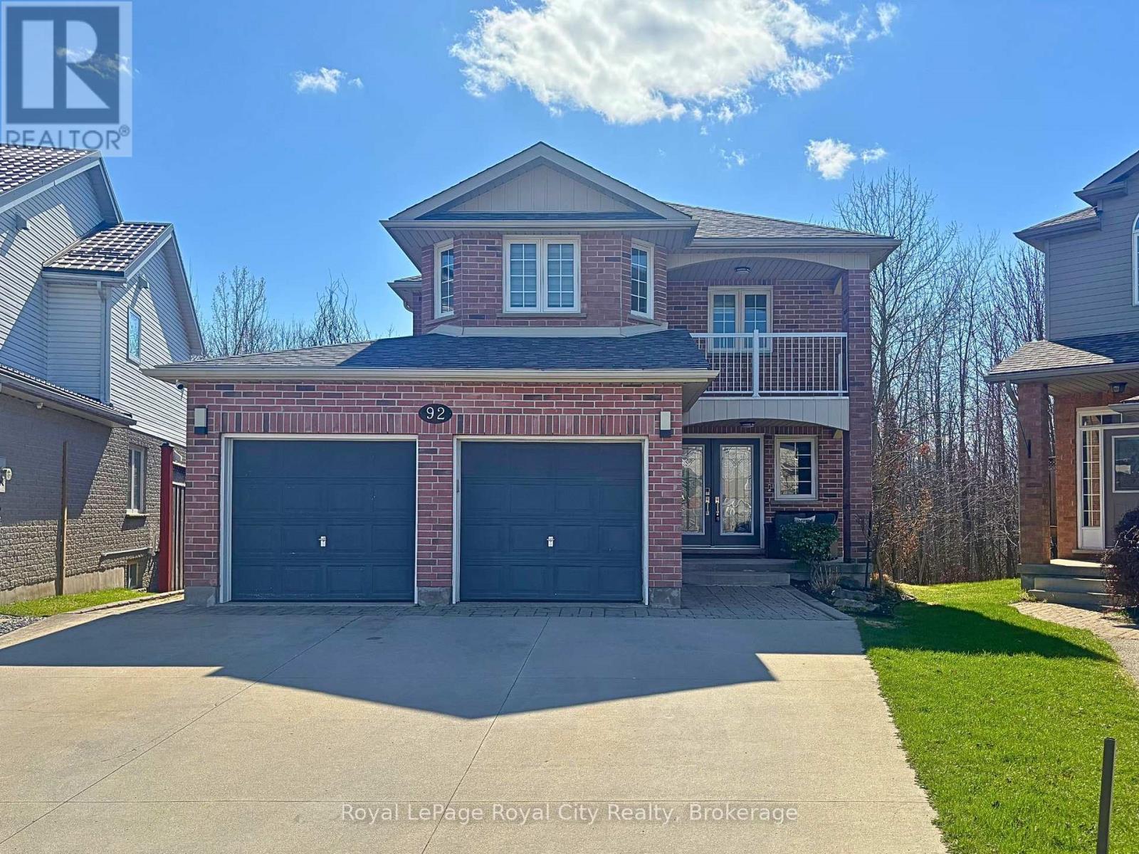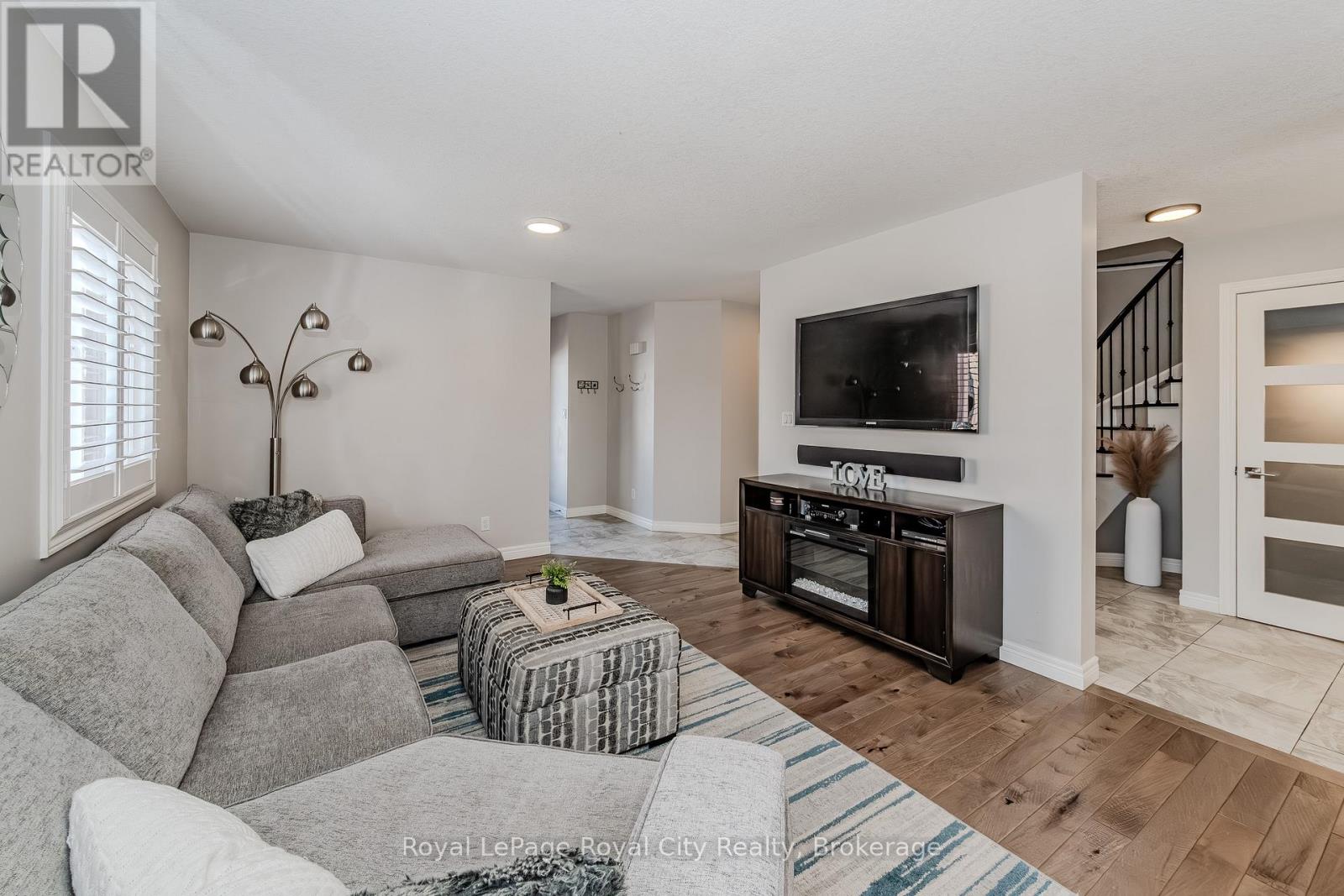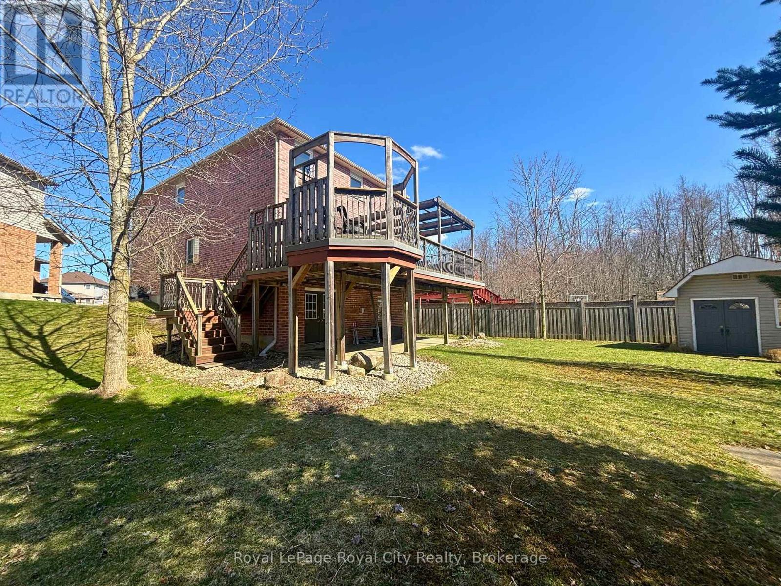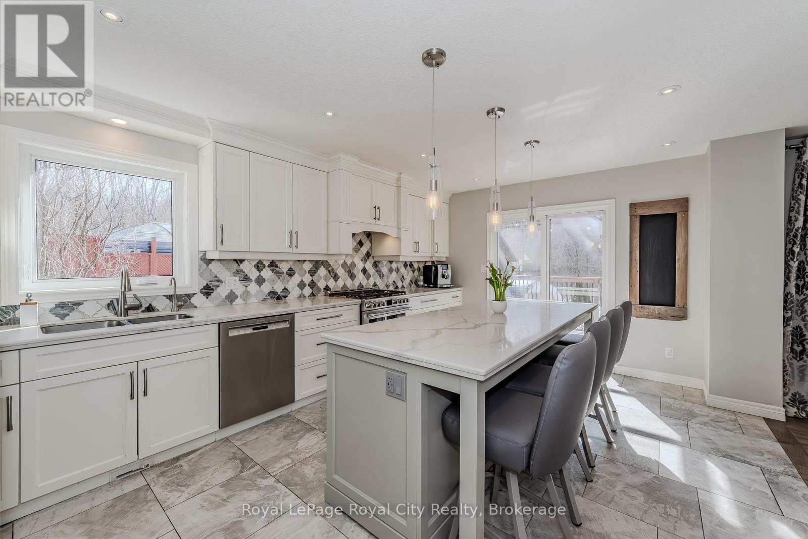 This exceptional 2,300+sqft home is nestled on a quiet cul-de-sac and backs onto scenic greenspace in one of Guelphs most desirable neighbourhoods. The meticulously maintained and tastefully renovated interior showcases an inviting open concept living and dining area that is beautifully enhanced by engineered hardwood flooring and large windows. The heart of the home is the elegant kitchen, featuring Quartz countertops, a spacious island with a breakfast bar, and sleek modern finishes- perfect for both casual meals and entertaining. Patio sliders from the kitchen lead to an expansive upper deck, ideal for enjoying morning coffee or evening barbeques while overlooking the lush, private backyard. The main level also offers a convenient office space and a 2 piece bathroom. A grand curved staircase ascends to the second level, hosting the stunning primary suite, three additional generously sized bedrooms (one with private access to the balcony), and a 4 piece main bathroom. The primary retreat boasts a walk-in closet and a luxurious 4 piece ensuite, featuring a glass-enclosed shower and a deep soaker tub. The fully finished walk-out basement is designed for relaxation and entertainment, offering a huge recreation room with an attractive gas fireplace, a laundry area, and a 3 piece bathroom. Enjoy direct access from the basement out to the patio area with beautiful gardens and a sprawling backyard. Additional features include a concrete driveway, a spacious 2-car garage, and impeccable curb appeal. Located close to parks, schools, shopping, and trails, this home is a rare find and a must see! (id:14494)