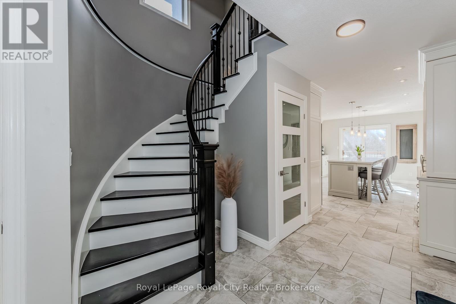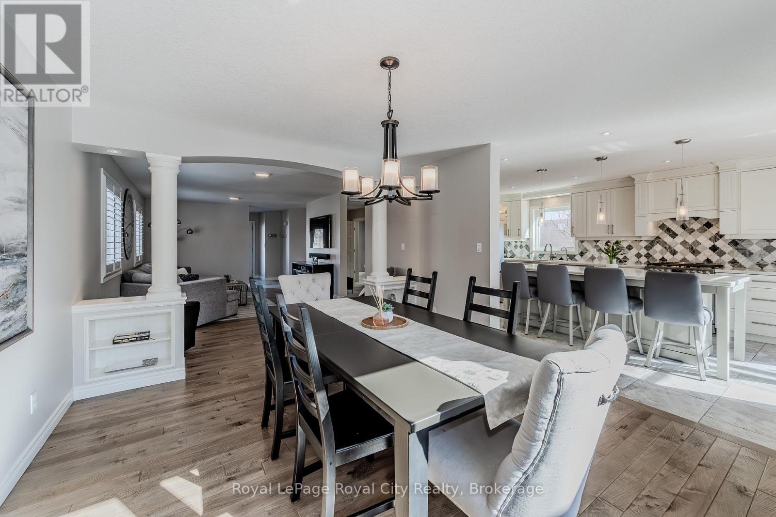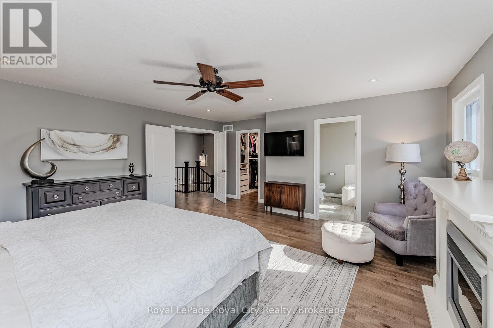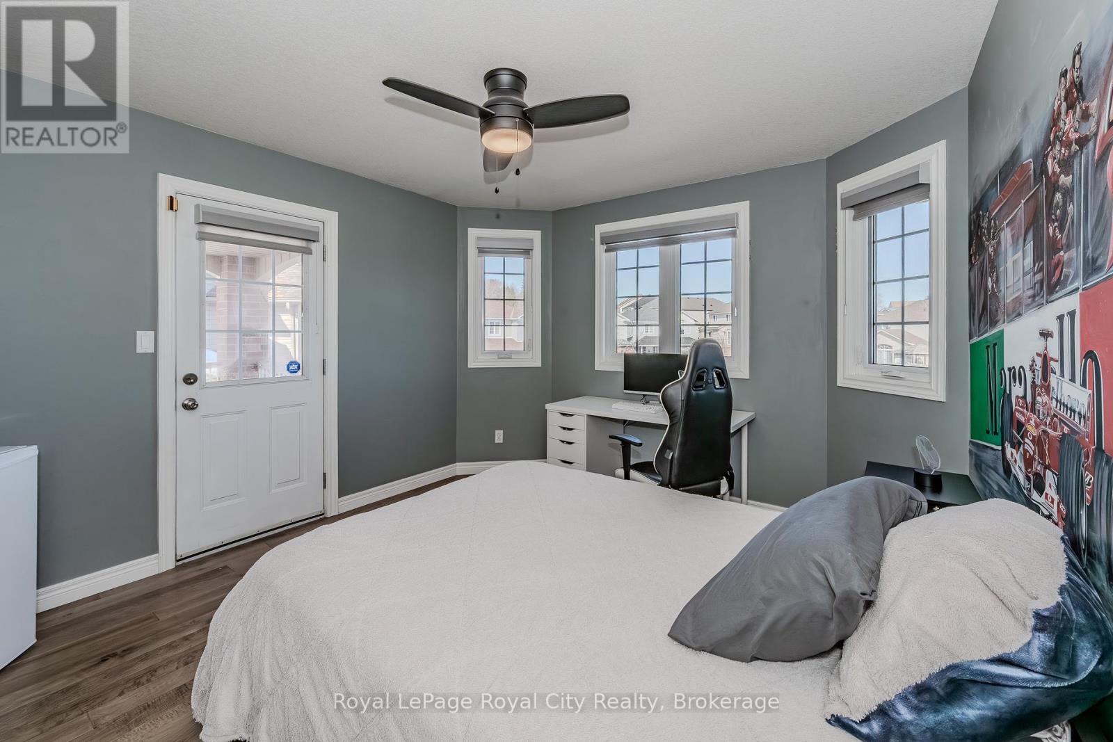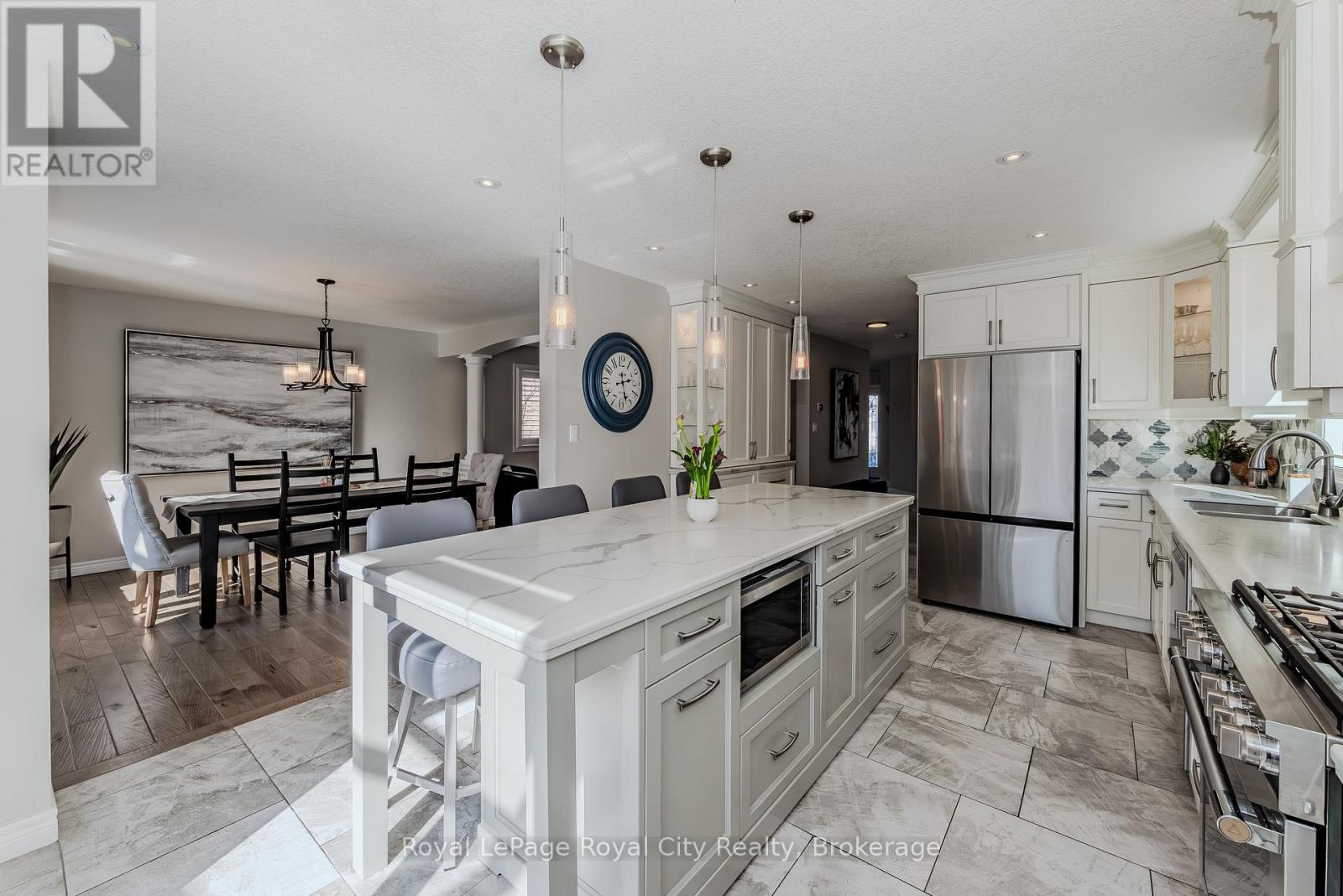 This exceptional 2,300+sqft home is nestled on a quiet cul-de-sac and backs onto scenic greenspace in one of Guelphs most desirable neighbourhoods. The meticulously maintained and tastefully renovated interior showcases an inviting open concept living and dining area that is beautifully enhanced by engineered hardwood flooring and large windows. The heart of the home is the elegant kitchen, featuring Quartz countertops, a spacious island with a breakfast bar, and sleek modern finishes- perfect for both casual meals and entertaining. Patio sliders from the kitchen lead to an expansive upper deck, ideal for enjoying morning coffee or evening barbeques while overlooking the lush, private backyard. The main level also offers a convenient office space and a 2 piece bathroom. A grand curved staircase ascends to the second level, hosting the stunning primary suite, three additional generously sized bedrooms (one with private access to the balcony), and a 4 piece main bathroom. The primary retreat boasts a walk-in closet and a luxurious 4 piece ensuite, featuring a glass-enclosed shower and a deep soaker tub. The fully finished walk-out basement is designed for relaxation and entertainment, offering a huge recreation room with an attractive gas fireplace, a laundry area, and a 3 piece bathroom. Enjoy direct access from the basement out to the patio area with beautiful gardens and a sprawling backyard. Additional features include a concrete driveway, a spacious 2-car garage, and impeccable curb appeal. Located close to parks, schools, shopping, and trails, this home is a rare find and a must see! (id:14494)